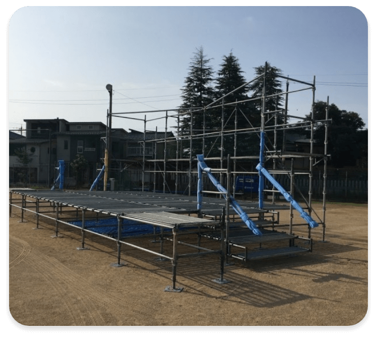 最近ではコロナ禍で中止となっていた野外ステージ関連の需要が増えています。 当社では新たに野外ステージ関連例えば体育祭の観客席、お祭りのステージ構築等の組み立ても承っております。 価格:寸法H 1m×W5.4m×D5.4mで15万円~ ※直前にセットし、終了後は即時撤去致します。